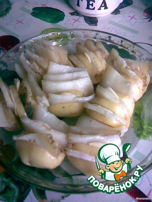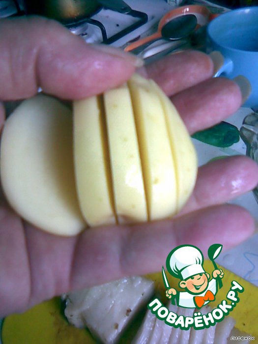 • В картофельные надрезы вложить пластинки сала и пластинки чеснока.