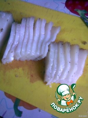 • Сало порезать пластинками (я брала сало в соли и черном перце).