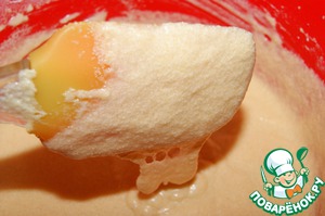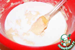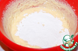 Добавить муку, смешанную и просеяннную с разрыхлителем, и перемешать лопаткой.