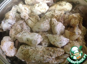 Охлажденную курицу очищаем от кожицы и хорошо обмазываем каждый кусок специями
