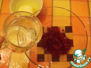 Свеклу натираем на мелкой терке. Мезгу заливаем кипятком (бОльшая часть нормы), накрываем крышкой и оставляем на полчаса.