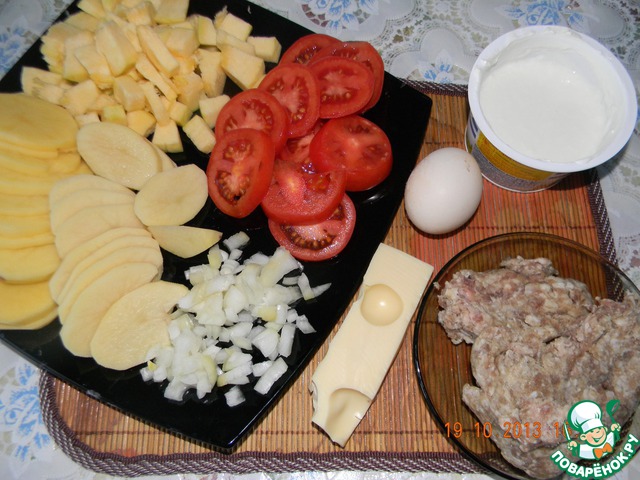 Чтобы приготовить запеканку "Люкс", потребуется: картофель, лук, кабачки, мясной фарш, чеснок, яйца, сметана, бульон, твердый сыр, соль, масло, специи (выбор по желанию). Все овощи вымыть, обсушить и почистить. Картофель, кабачки нарезать кружочками. Лук нарезать кубиками. Лук обжарить на масле до золотистого цвета, добавить фарш и потушить все вместе 5 минут.