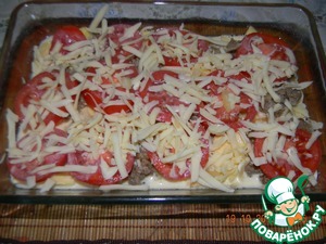Полить яично-сметанной смесью, добавить бульон и посыпать тертым сыром. -