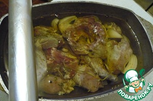 Кладем крупно резанный лук и чеснок, специи. Перемешиваем и заливаем маслом так, чтобы мясо было покрыто полностью. Закрываем сверху фольгой. -