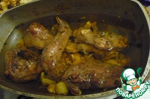 В первый раз я увидела это блюдо несколько месяцев назад в передаче "Правила моей кухни". Это кулинарное шоу, где 12 пар непрофессионалов борются за приз. Ну, не в этом дело. Блюдо делается в большом количестве масла, на небольшом огне, несколько часов. Вот сколько раз его делали, с разным мясом и даже с овощами, говорят, что мясо просто тает при такой технологии. Меня смущало масло, но я все-таки не выдержала и сделала кролика. Уж больно у него мясо суховатое. Знаете, я даже не ожидала такого результата. Мясо просто тает и масла почти нет. Намного меньше чем, если делать в кляре.