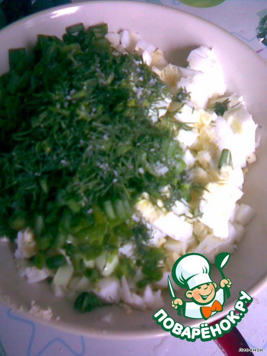 Лук измельчить. Смешать с яйцами, посолить, добавить майонез, перемешать. -