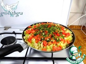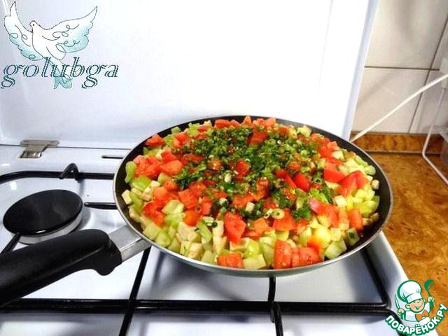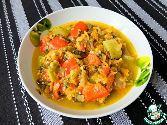 Затем к готовой пассеровке выкладываем овощи, добавляем 1/2 ст. овощного бульона или воды, растительное масло, растертый с солью чеснок, приправы, можно добавить порубленную зелень. Хорошо перемешиваем и тушим под крышкой 30 минут, периодически перемешивая.