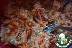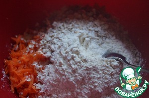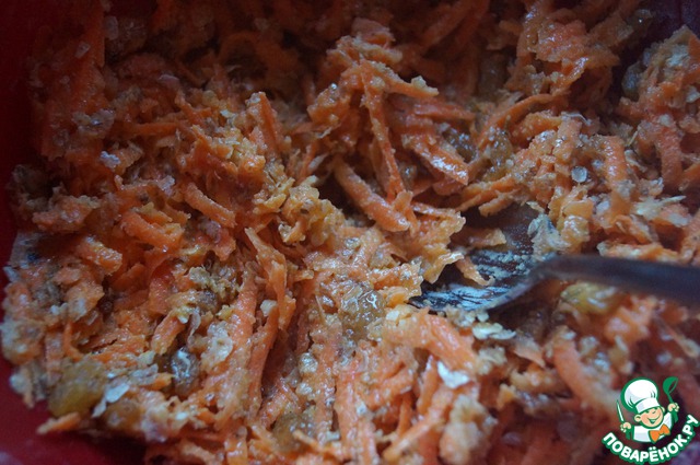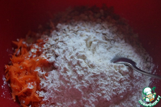 Ещё раз тщательно перемешаем и оставим минут на 15. За это время морковь пустит сок, а хлопья немного набухнут. Вымесим наше тесто. Оно будет липким.