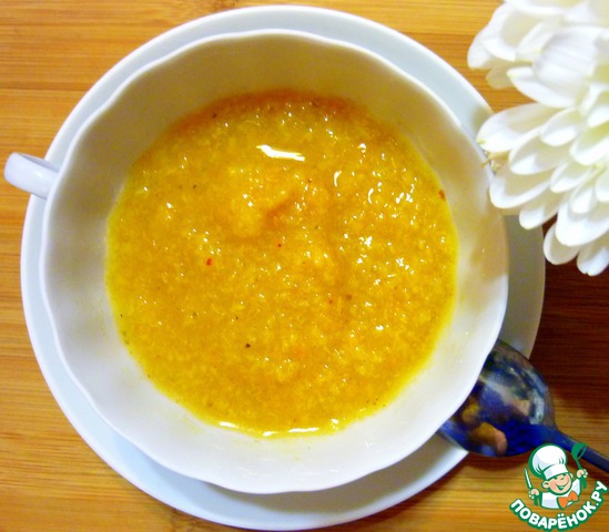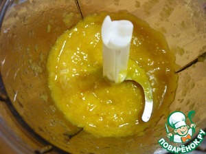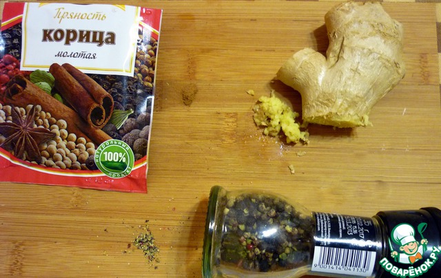 Добавляем к получившемуся пюре натертый на мелкой терке имбирь, хорошую щепотку молотой корицы и щепотку черного перца...