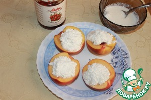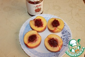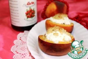 Рецепт «Персики, запеченные с клюквенным соусом, козьим сыром и с ароматным штрейзелем»: