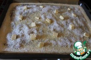 Сверху заливки посыпаем смешанным кокосом с сахаром. И сверху кусочки масла кладем.