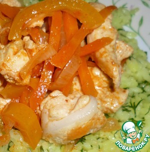 Затем убавляем огонь, добавляем немного воды, морковь, накрываем крышкой, тушим несколько минут, затем добавляем лук и болгарский перец, снова под крышку, тушится 5-7 минут, потом добавляем томатную пасту (по желанию). После этого я перекладываю курочку в кастрюлю, если сковорода глубокая, можно этого не делать.