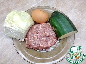 Нам понадобятся кабачок, капуста, фарш, одно яйцо, соль, специи. Я взяла свиной фарш, но подойдет и говяжий.