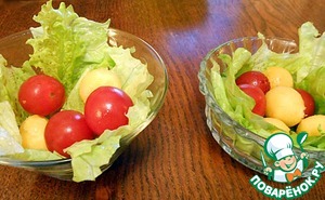 На листья уложить по 2-3 шарика тыквы и помидорок-черри. Их также сбрызнуть бальзамическим уксусом.