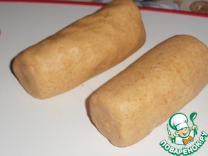 Разделить на 2 колобка, сформировать колбаски 5 см диаметре, завернуть в пленку и на 30 минут убрать в холодильник.