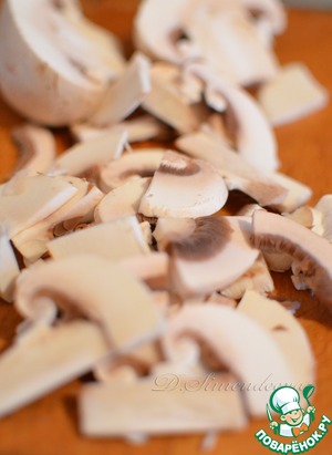 • Шампиньоны нарежьте тонкими ломтиками и сразу замаринуйте их в нашем оливковом масле минут на 20, пока подготавливаются остальные продукты.