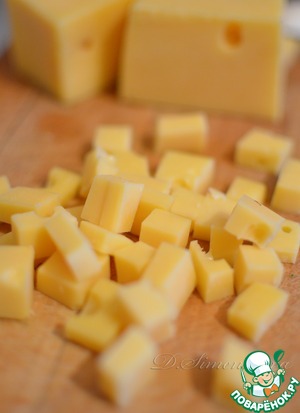 • Сыр нарежьте кубиками. Эмменталь обладает пикантным фруктово-ореховым ароматом и сладковатым вкусом.