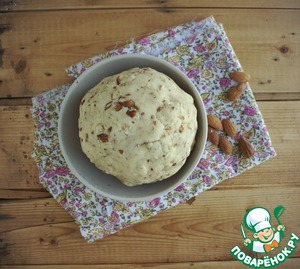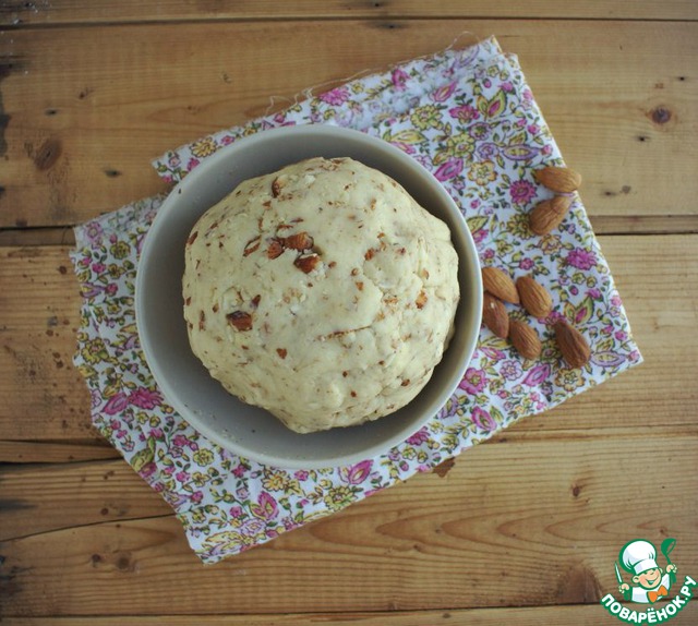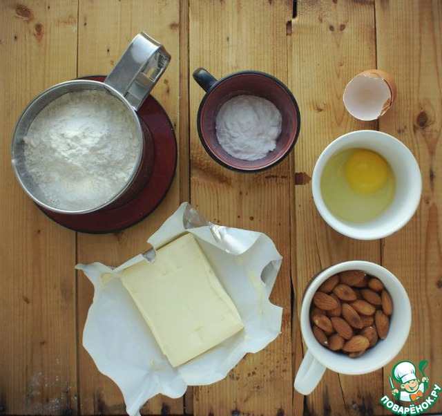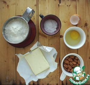 Для теста смешайте масло, сахарную пудру, просеянную муку, яйцо, чашку миндаля, пекарский порошок и соль.