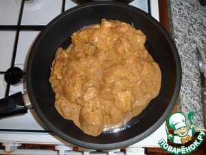 На раскаленную сковороду, выливаем растительное масло, мясо вместе с маринадом и на сильном огне обжариваем его без крышки около 10 минут.