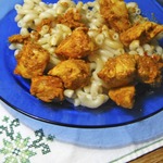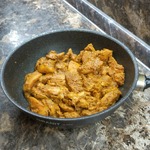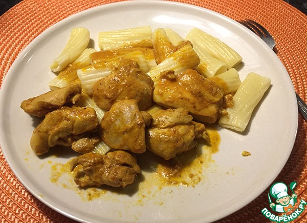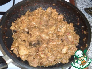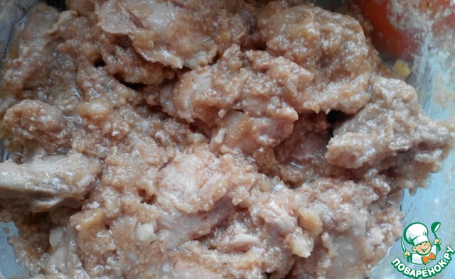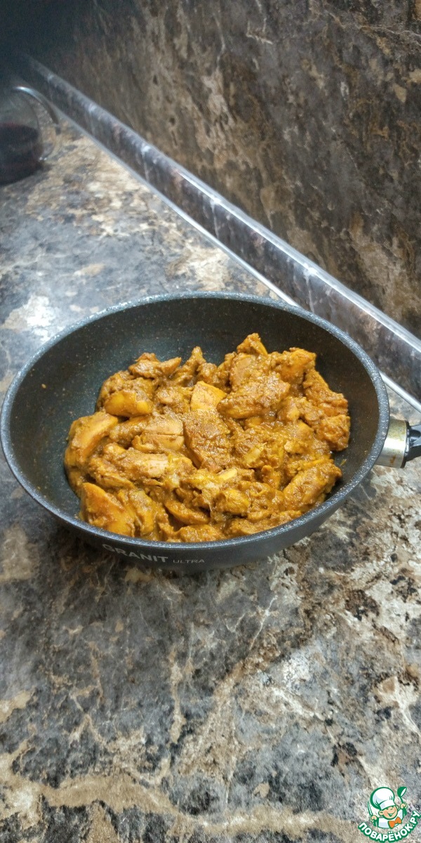 Процесс маринования мяса не заснят. Но сложного там ничего нет. Вырезаем кости, кожу и лишний жир из курицы. Нарезаем ее кусочками 1,5-2 см. Чистим острый перец от перегородок и семян. Трем имбирь, давим чеснок. В чаше блендера смешиваем кефир, перец, имбирь, чеснок, карри, соевый соус, томатную пасту, соль. Маринадом заливаем мясо и оставляем минимально на три часа. (я мариновала сутки).