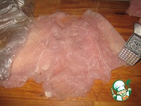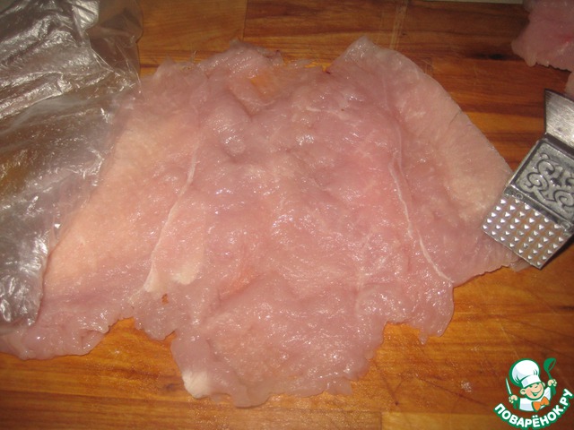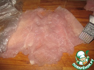 Разверните филе как книгу. Слегка отбейте каждый кусочек, накрыв пленкой. |