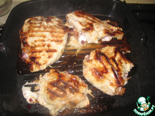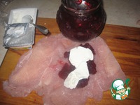 Выложите на одну половинку филе 1 ст. л. брусничного соуса, сверху - примерно 1 ч. л. мягкого козьего сыра. Накройте второй половинкой филе и скрепите деревянной зубочисткой. |