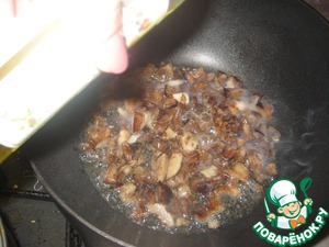 Грибы мелко нарезать и обжарить на 1 ст. л. растительного масла примерно 7-8 мин. Помешивая.