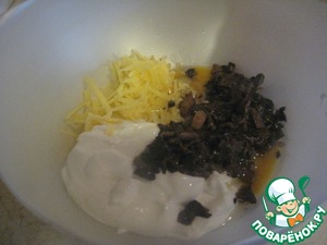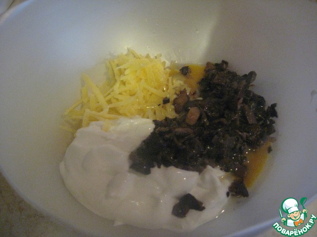 Смешать 1 яйцо, сливки, грибы м половину натертого сыра.