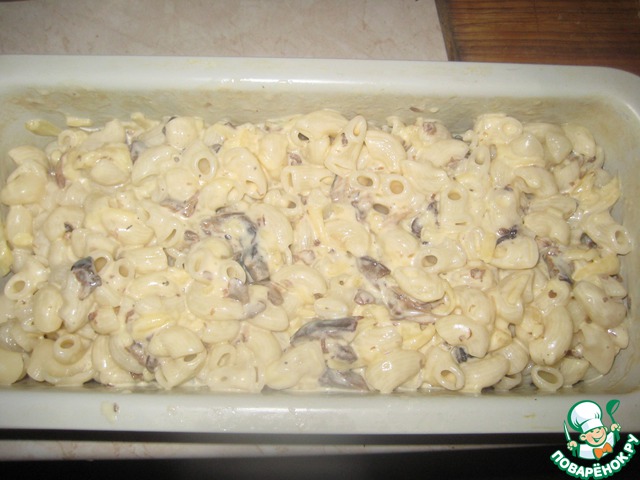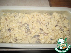Макароны перемешать с бульоном, 50 г. натертого сыра, влить сливочно-яичную массу. Аккуратно перемешать. Выложить в прямоугольную форму.