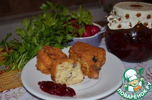 Готовые крокеты украсить брусничным (либо клюквенным соусом) и подавать как гарнир, либо как самостоятельное блюдо со свежей зеленью и овощами.
