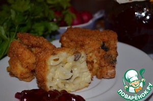 Кроекты получилось очень вкусные и необычные. Прочитав рецепт, я думала: ну что вкусного в макаранной запеканке? Но, попробовав, была просто очарована - вкусны и крокеты, и просто макаронная масса, вся пропитана сливками и ароматом грибочков...