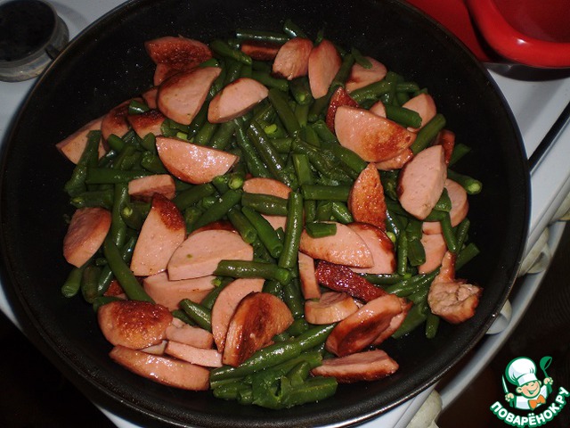 Фасоль отварить до готовности. Соединить с рубленым луком, нарезанными ломтиками сардельками и жарить на масле 5 мин.