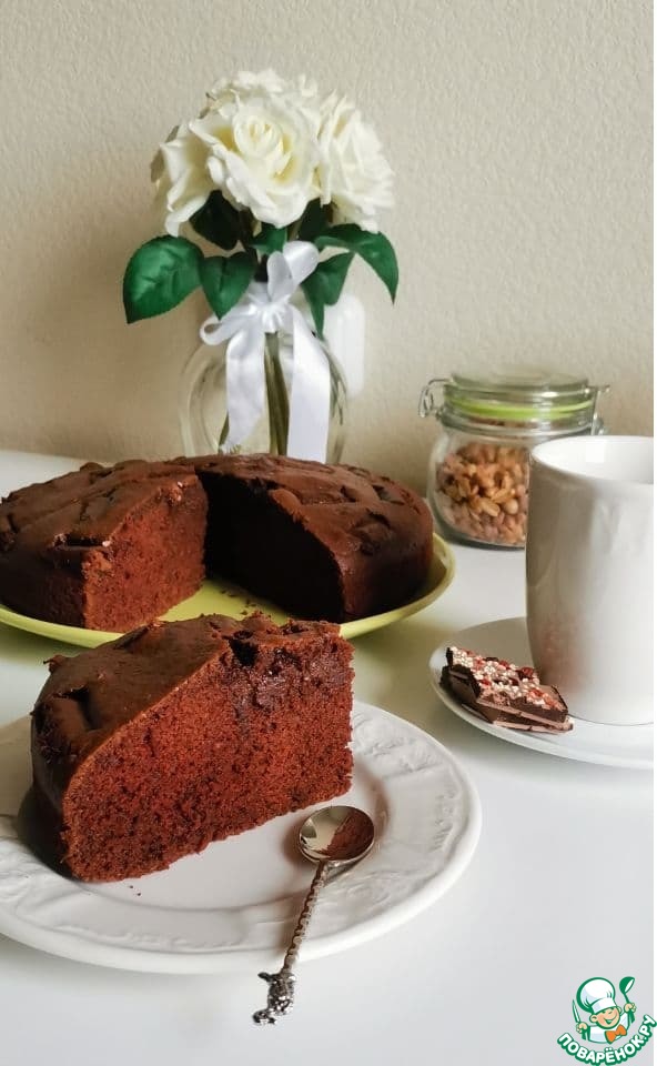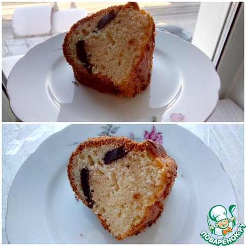 Форма у меня была 24 см. Следовала строго рецепту, ингредиенты не меняла. Только шоколад брала пористый молочный сразу с холодильника и клала не в середину, а сначала вылила 2/3 теста, а потом 1/3, след. раз сделаю 50/50, побоялась, что шоколад утонет на дно. Мужу пирог очень понравился в меру сладкий, не приторный. Он пил его с молоком.