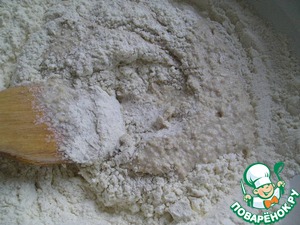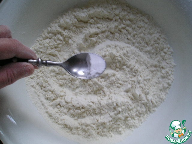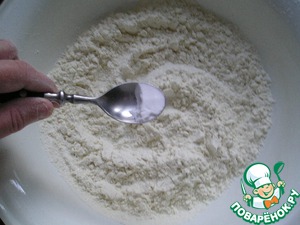 Тщательно перемешайте 1,25 стакана сильной пшеничной муки и 1/2 ч. л. соды (соду не гасить) -