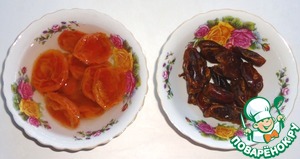 Курагу залить кипятком и оставить на 15-20 минут, из фиников вынуть косточки.