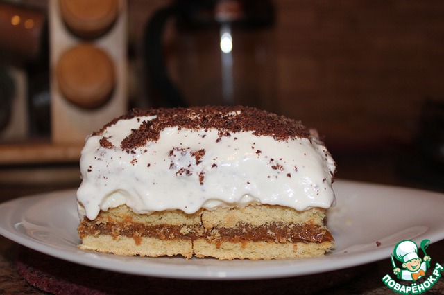 Сверху выкладываем банку вареной сгущенки. Разравниваем ее аккуратно. И сверху кладем еще слой печенья.