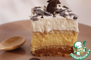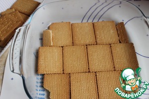 Печенье – крекер французский с кунжутом "Яшкино". Пачка 185 г. Пошло 2 пачки как копеечка. Форма у автора квадратная, у меня – прямоугольная 25*30. Правда, один слой – третий (перед взбитыми сливками) я сделала из 2- слоёв печенья. Крем варить не стала, пудинга не было в пакетиках. И я решила купить ванильный пудинг "Чудо" фирмы вим-билль-дан. 4 баночки по 125 граммов. И нисколько не пожалела. Количества более, чем достаточно, а вкус отличный. Что меня подвело, так это сливки. Покупала 33% Петмол. Не взбились. Причём, представляете, онив пачке уже с загустителем. Это недоразумение какое-то. Обычно я использую сливки 32%, нашего белорусского производителя, но они оч.редко бывают в продаже. Взбиваются зато на раз, два, три, без всяких добавок. У меня был пакетик загустителя, слава Богу, я его сыпанула, кое-как взбила.