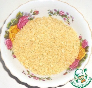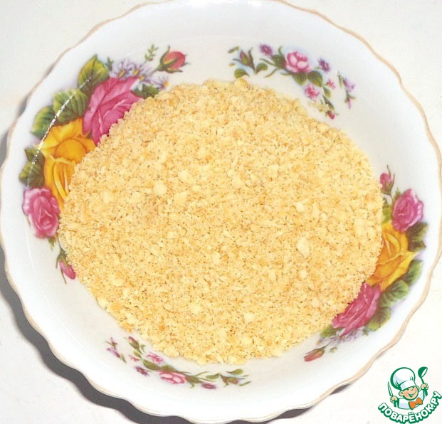 Крекер или песочное печенье измельчить в крошку. По желанию можно добавить любые измельчённые орехи.