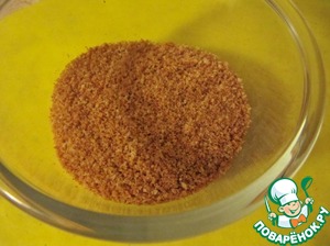 С готового бисквита срежьте верхние уголки, чтобы сделать форму полукруглой, раскрошите в блендере. Если крошка бледновата, то получившуюся крошку нужно поджарить до золотистого цвета на сухой сковородке. Остудите.