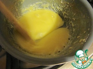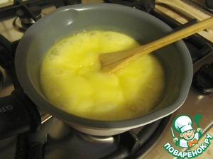 Для этого 2 куриных желтка тщательно смешать со 125 г молока, затем добавить сахар (185 г). Поставить на небольшой огонь и при постоянном помешивании довести до кипения. Будьте аккуратны, вначале смесь нужно нагревать МЕДЛЕННО, иначе желтки могут свернуться. -