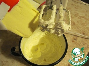 Добавляйте по столовой ложке остывший сироп в масло, продолжая взбивать при этом. В конце влейте коньяк, перемешайте.