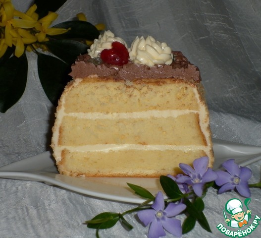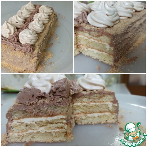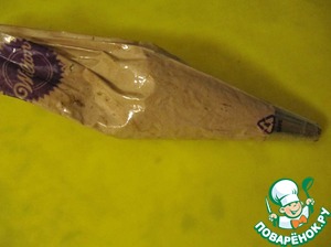 Сироп для пропитки: 100 г сахара и 115 г горячей воды смешать до полного растворения сахара. Добавить коньяк и остудить.