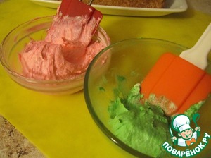 Отложите от основного количества белого крема по полной столовой ложке крема - одну подкрасьте в розовый цвет, другую - в зеленый. Я использовала гелевые красители на кончике зубочистки, можно использовать сок свеклы и шпината.