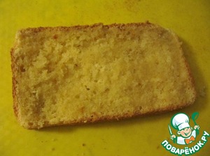 Для торта разрежьте бисквит на три пласта, каждый пропитайте сиропом для пропитки.