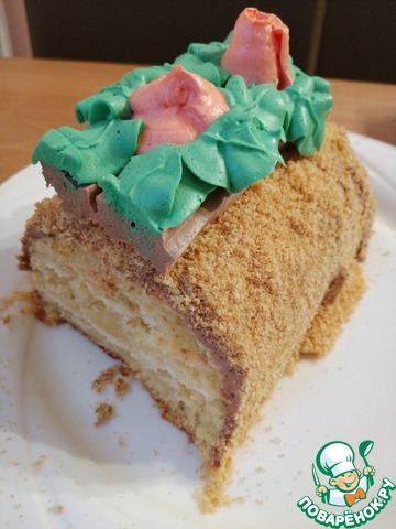 Каждый пласт бисквита после пропитки промажьте белым кремом, сложите друг на друга. Бока смажьте кремом с какао, посыпьте жареной крошкой. Оставшийся крем разложите по корнетикам: розовый - с насадкой для цветочков, зеленый - с насадкой для листочков, шоколадный (с какао) - с насадкой для полосок.