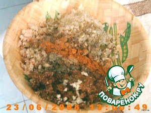 Овощи: овощи пропустить ч/м, и выжать сок, нарезать чеснок, положить яйца, муку.