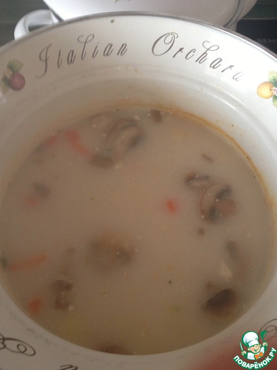 Пока лук тушится, бросить в закипевший бульон полтора-два сырка для супа, порезанные на кусочки, чтобы они там растворились.