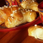Получается 15-20 круассанов в зависимости от размера (это из половины теста). Оставляем на расстойку при комнатной температуре до увеличения в 2 раза. Сейчас, когда довольно прохладно, можно поставить расстойку на ночь, и утром печь круассаны к завтраку. Перед выпечкой смазать круассаны слегка взбитым яйцом и посыпать сахаром.
