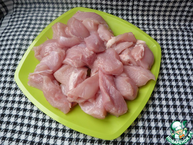 Филе индейки нарезать на кусочки, которые затем будут нанизываться на шпажки.