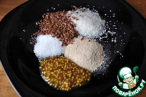 Берём соль, сахар, активные дрожжи, готовую горчицу, лучше с семенами, они дают приятный привкус хлебу при раскусывании. Также берём семена льна, они продаются в любой аптеке и в отделах для больных сахарным диабетом в магазинах.